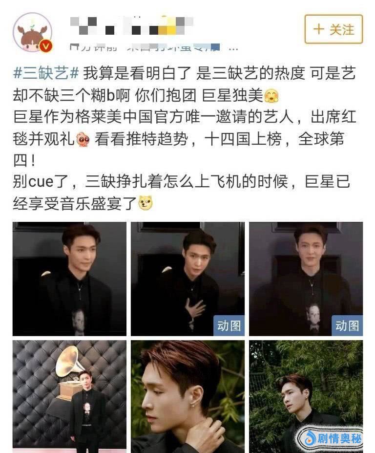 61届格莱美在2月11日在洛杉矶举行,张艺兴作为官方受邀的唯一中国音乐人出席,本来是一件高兴的事,但热搜榜上却引发了一连串的相关热搜词,“鹿晗感谢吴亦凡黄子韬”、“三缺艺”、“高晓松邀请谭维维观礼格莱美”、“张艺兴坐观众席”等等。