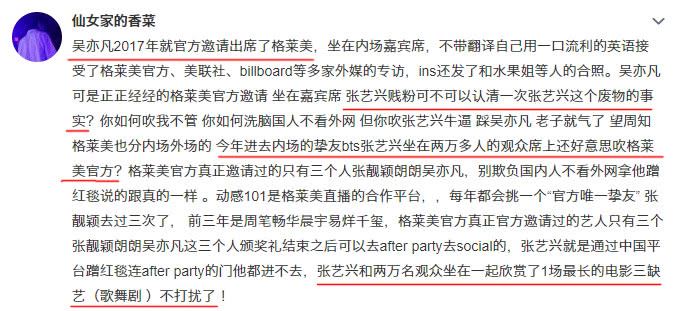 四个人同属流量小生,谁的粉丝也不比谁少,当然也不会客气,吴亦凡的粉丝就在回怼“吴亦凡2017年就官方邀请出席了格莱美,坐在内场嘉宾席。张艺兴贱粉可不可以认清一次张艺兴这个废物的事实?张艺兴就是通过中国平台蹭红毯连after party的门他都进不去,张艺兴和两万名观众坐在一起欣赏了1场最长的电影三缺艺(歌舞剧 )不打扰了 !”