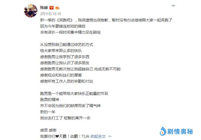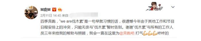常驻嘉宾鹿晗同样也回应了,他在社交平台上告诉大家由于其他工作和节目日程安排上的冲突,只能无奈与“伐木累”暂时告别了,而陈赫的原因也很简单,就是因为今年要接连拍戏的缘故,会有很长一段时间集中精力呆在剧组,但能看出这几位嘉宾都非常不舍得《跑男》这个大家庭,也很可惜他们不能继续了。