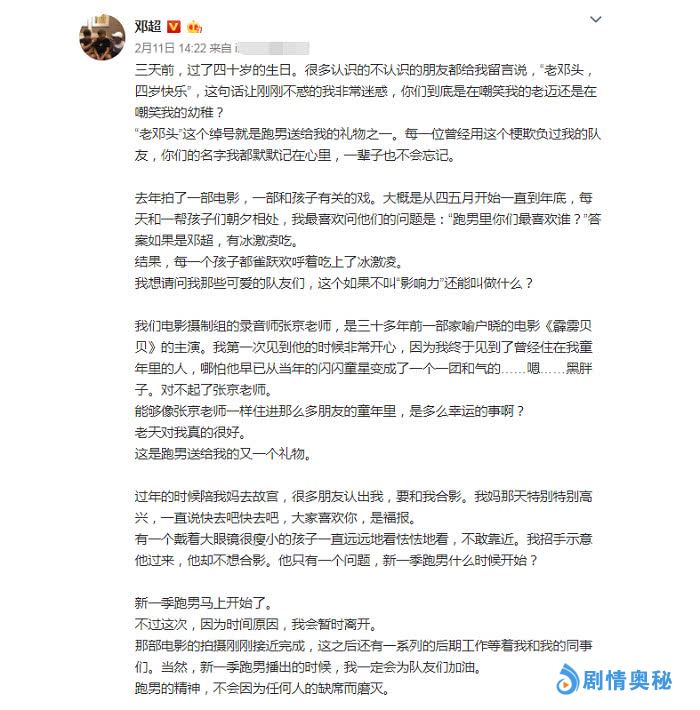 退出的4位成员也都发文回应了原因,唯独一人提到了热巴,首先就是《跑男》中的主心骨邓超,官宣后邓超也发文告诉大家新一季的跑男自己因为时间的原因,会暂时离开,主要还是因为自己的新电影刚刚拍摄完成,估计也还有很多后续的工作需要邓超来策划吧!也不知道没有了邓超下一季《跑男》会是个怎样的场面呢?