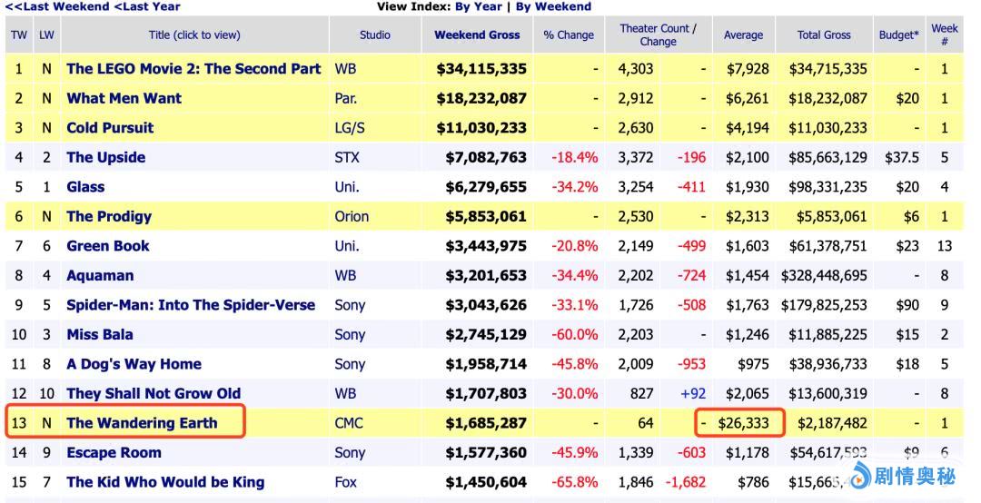 根据美国票房网站boxofficemojo的统计,《流浪地球》上周在北美64家影院开画,收获168万美元票房,单馆成绩高达26000美元,这个单馆成绩非常惊人,比上周北美冠军《乐高大电影2》高了3倍多(《海王》刚开画的单馆成绩只有16000美元)。此外,《流浪地球》在全球最著名的电影网站IMDb上的评分也高达8.0分,这个评分与美国科幻大片《火星救援》一样,比前几年轰动一时的《地心引力》的评分还要高。