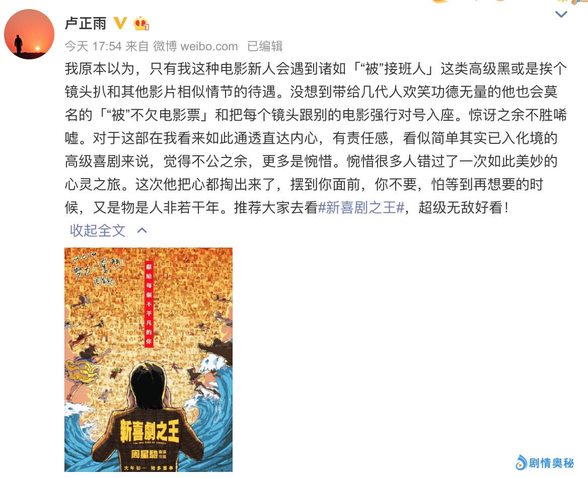 2月12日下午,曾自导自演《绝世高手》、参演《美人鱼》《西游降魔篇》的卢正雨在自己的微博发文力挺周星驰的新电影《新喜剧之王》。