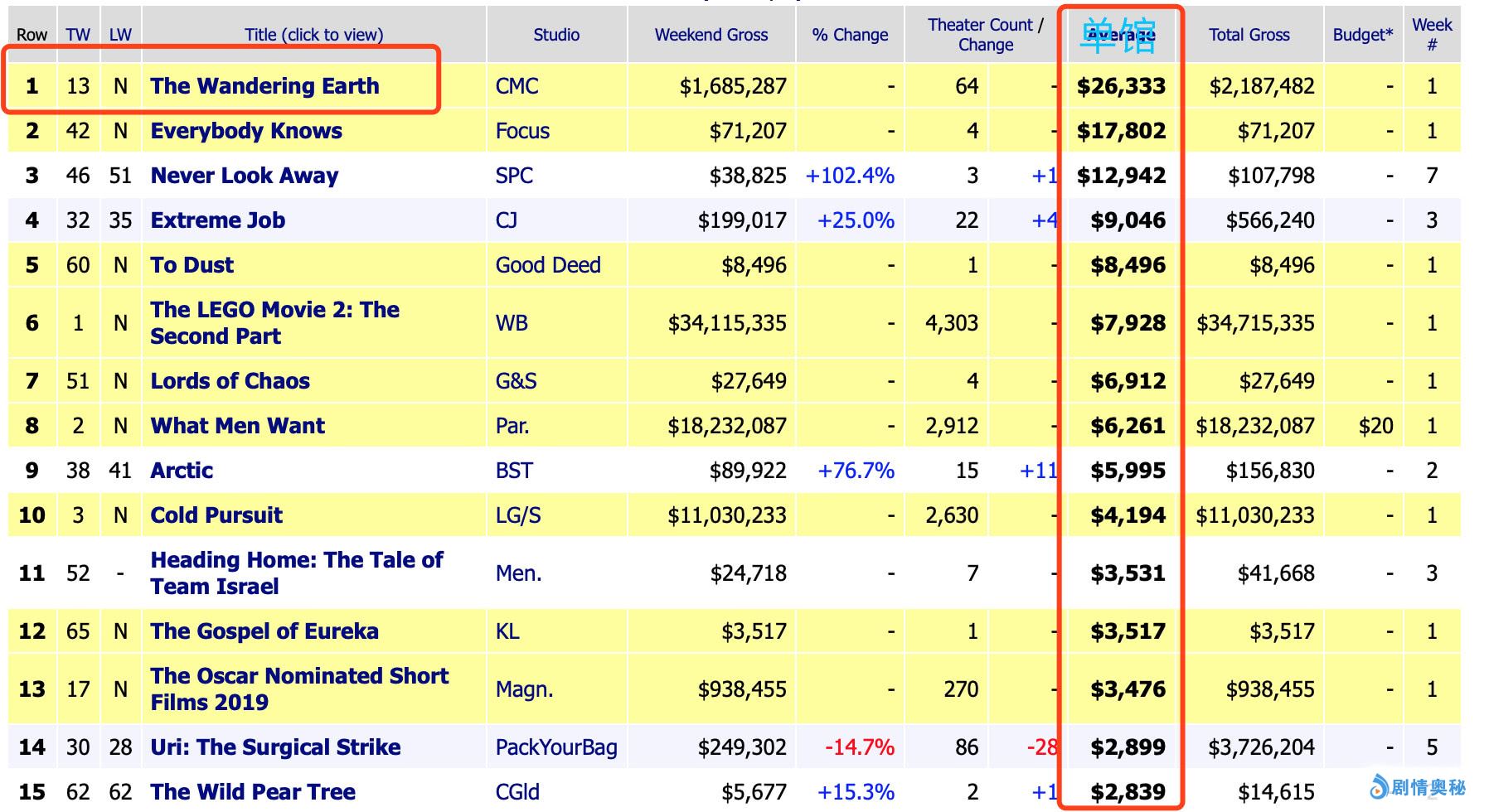综上所述,《流浪地球》北美首周169万美元(累计已达220万)、单馆26300美元,表现十分亮眼,请不要轻信那些《流浪地球》在北美票房惨败的言论!另外,多说一句,在上周北美正在上映的近100部电影里,流浪地球的单馆成绩排名第一,远远超过冠亚军影片《乐高大电影2》和《倾听男人心》。