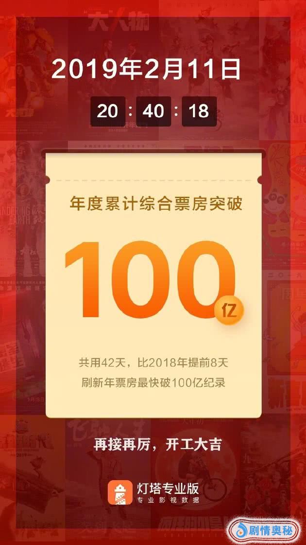 据灯塔专业版数据显示,截至2月11日20点40分,今年内地票房突破100亿,比去年提前8天,创造年度票房最快破百亿纪录。