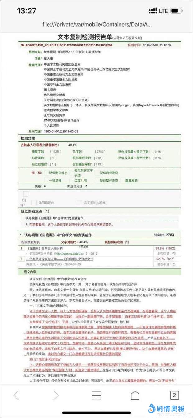 有网友发现,翟天临在北京电影学院就读博士期间发表的一篇论文《谈电视剧中“白孝文”的表演创作》,查重检测报告显示相似度超过50%、知网上文字重复比为40.4%,总字数2783的文章中重复字数多达1125个。