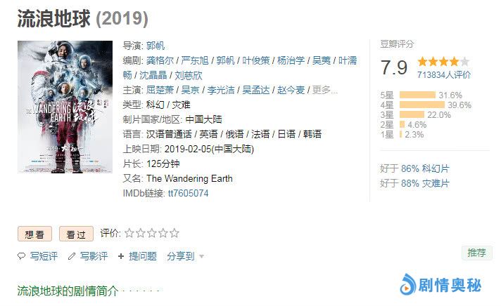 2018年贺岁档中,凭借口碑完美逆袭的《红海行动》验证了观众说好才是真的好的硬道理。如今时隔一年之后,凭借豆瓣开画8.5分的《流浪地球》延续了《红海行动》的成功道路,依靠超高的口碑完美逆袭贺岁档,一度领跑贺岁档,登顶口碑、票房榜榜首位置。截止发文时间,影片上映9天,以豆瓣7.9分,累计总票房破26亿。