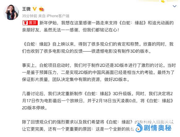 据悉,由追光动画、华纳兄弟联合出品的高分动画电影《白蛇:缘起》宣布,将于2019年2月18日停映该片的2D版本,同时宣布将开启《白蛇:缘起》的3D版本制作,并计划于2019年年内重新上映该片的3D版本。