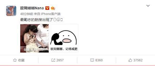 面对自己因为胖而上热搜,她在微博里调侃“最励志的热搜出现了”,看来娜比这次要认真减肥了。