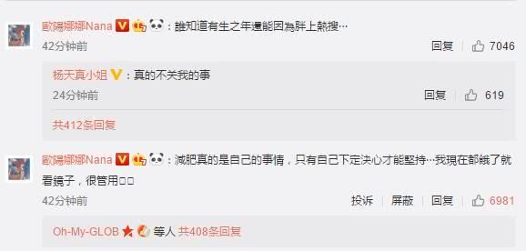在评论里她还说道:谁知道有生之年还能因为胖上热搜,还表示:减肥真的是自己的事情,只有自己下定决心才能坚持,我现在饿了就看镜子,很管用。