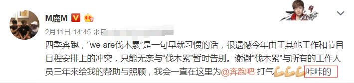 鹿晗发文首先是怀念了一下奔跑大家庭,之后跟大家解释因为工作和节目日常安排上的冲突,只能与跑男暂时告别了,他也表示自己会一直为节目打气,吸人眼球的还是最后三个字“咔咔的”,估计大家第一眼就觉得眼熟了吧?但是鹿晗大方公布恋情时,女友关晓彤转发时就说了“咔咔的”这三个字,鹿晗如今说的还挺顺口呢!
