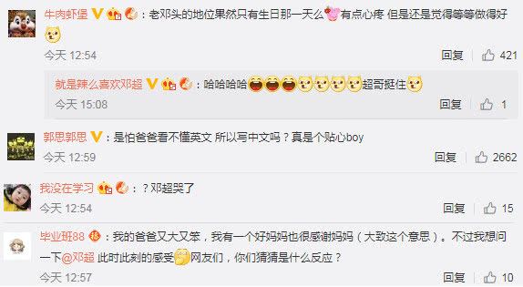 “是怕爸爸看不懂英文 所以写中文吗?真是个贴心boy!“不过最秀的还是网友们的神评论了。从等等给爸爸的评价用中文写,给妈妈的评价是英文写的状况来看,搞不好还真的是等等贴心,为了爸爸能看懂才写的中文。这逻辑完全没毛病。不过相信也有朋友不懂为什么邓超会看不懂英文,这个梗其实来自《跑男》。当然前几天邓超还说了他懂英文,至于信不信吗,就是广大网友的事儿了。生日过了就是过了,原先的家庭地位还是要保持的!比如邓超的,必须在三等以下。短暂的幸福可不是一直维持的错觉哦~还是要认清现实的说。
