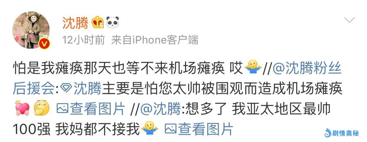结果这些调侃的话,粉丝上心了,和宁浩一起宣传《疯狂的外星人》的时候,沈腾吐槽:早晨发微博说没人接机,下午真有两个粉丝去机场接他,就去两个人,还不如没人呢!“粉丝能不能给沈腾一点排面”都成为了微博的热议话题 ,笑星就是笑星。