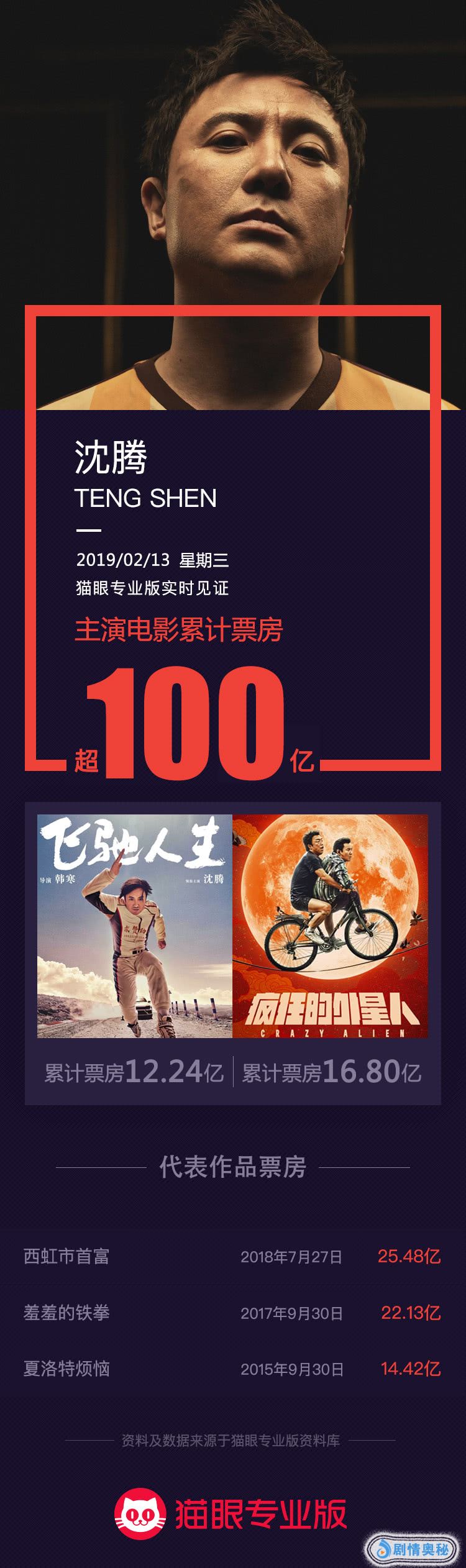 根据猫眼专业版数据显示,沈腾主演电影《飞驰人生》《疯狂的外星人》在春节档累计票房分别突破12.24亿、16.8亿,成功助力沈腾个人总票房突破100亿,排名中国票房男主角影人榜单第2名。