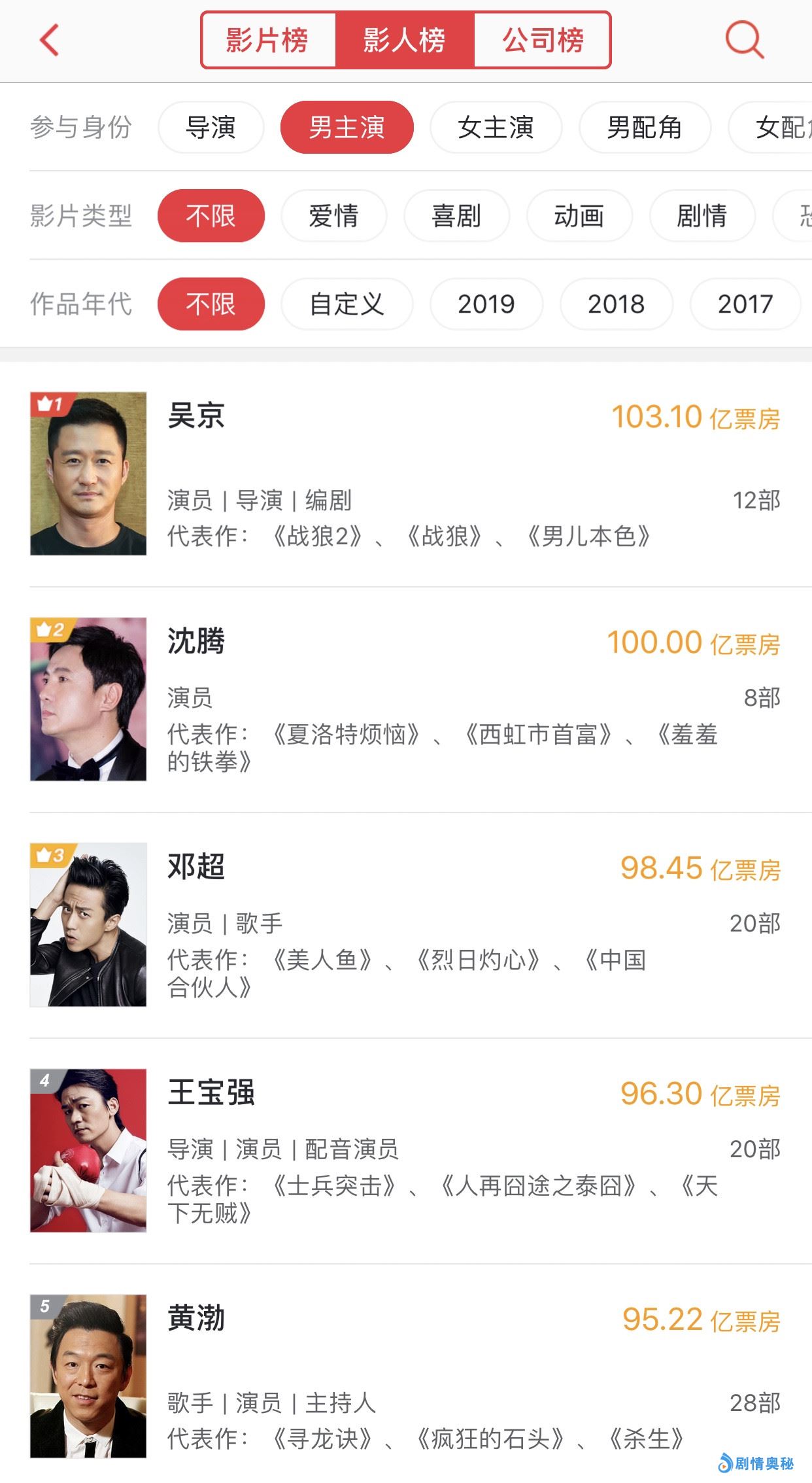 注:关于与其他数据平台,影人主演数据不一致问题,系数据统计方式不同导致。如,猫眼专业版对“友情出演”暂不计入“主演”票房统计。