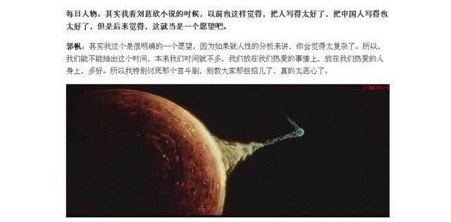 访问中,给郭帆导演的一道问题是,觉得刘慈欣的小说原著“把人写得太好了,把中国人写得也太好了,但是后来觉得,这就当是一个愿望吧”,之后郭帆导演就此谈起了这个“愿望”,他的原话是——