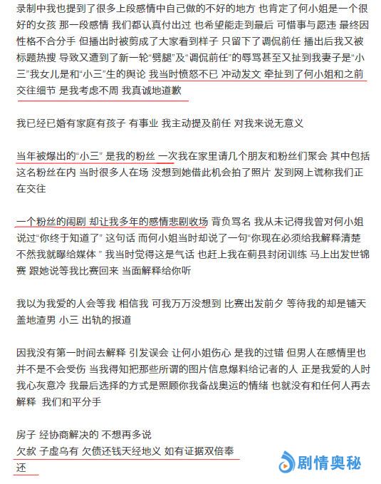 陈一冰称这位“小三”是“一个粉丝的闹剧,却让我多年的感情悲剧收场。 ”也否认自己对何雯娜说过“你终于知道了” 这句话。
