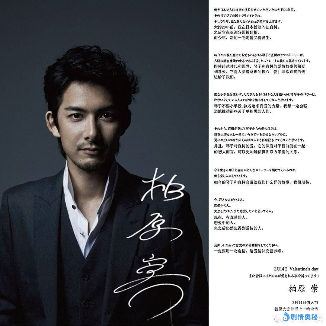 「大约在 20 年前,我在日本扮演江直树。之后它在亚洲各国被翻拍。而今年,新的一吻定情又将诞生。即使跨越时代和国界,琴子和直树的爱情故事仍然受到喜爱,它将人类潜意识的核心爱非常直接的传递给了我们。琴子不耍小手段,执着追求真爱的力量,我想一定会强烈得推动那些苦于单相思的人们。并且,琴子对直树的爱,它的深度对于目前能在一起的恋人而言,可以更加确信巩固双方亲密的关系。现在,有真爱的人。恋爱中的人。失恋后想要得到爱情的人。一定要用一吻定情,给爱情补充营养哦。」