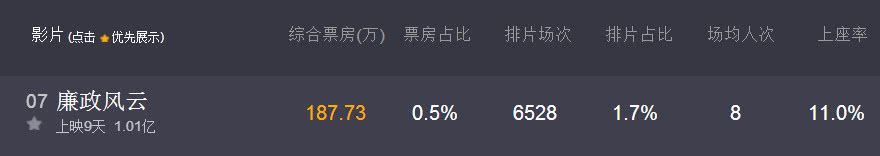 因为春节档竞争太过于激烈,所以《廉政风云》刚开始能够拿到的排片并不多,电影首日票房仅仅才5500万左右,相对于其他电影几个亿的单日票房来说差距很大。因为排片的缘故,所以《廉政风云》更多的是寄希望于电影口碑,希望能够通过质量拿下更多排片和票房。