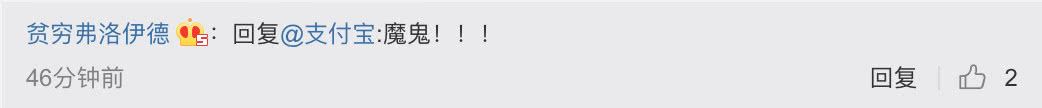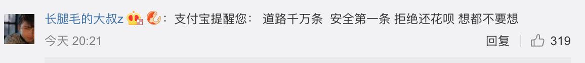 网友们也被支付宝这执着还钱的精神惊呆了,用《流浪地球》那句经典名言留言,“道路千万条,安全第一条,拒绝还花呗,想都不要想”,有的网友还直接回复支付宝“魔鬼”!