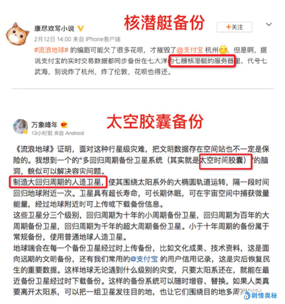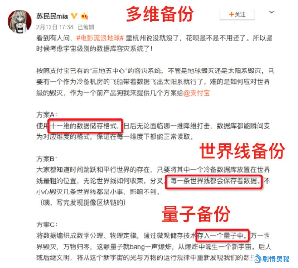 支付宝本尊现身说法,给我们搜集了各路科幻小说作家提供的方法,简直是打开了未来世界的大门啊。有的作家表示《流浪地球》编剧就是跟花呗有仇,所以才“蓄意”让杭州毁灭,其实“支付宝的实时交易数据都同步备份在七大洋的七艘核潜艇的服务器里了”。
