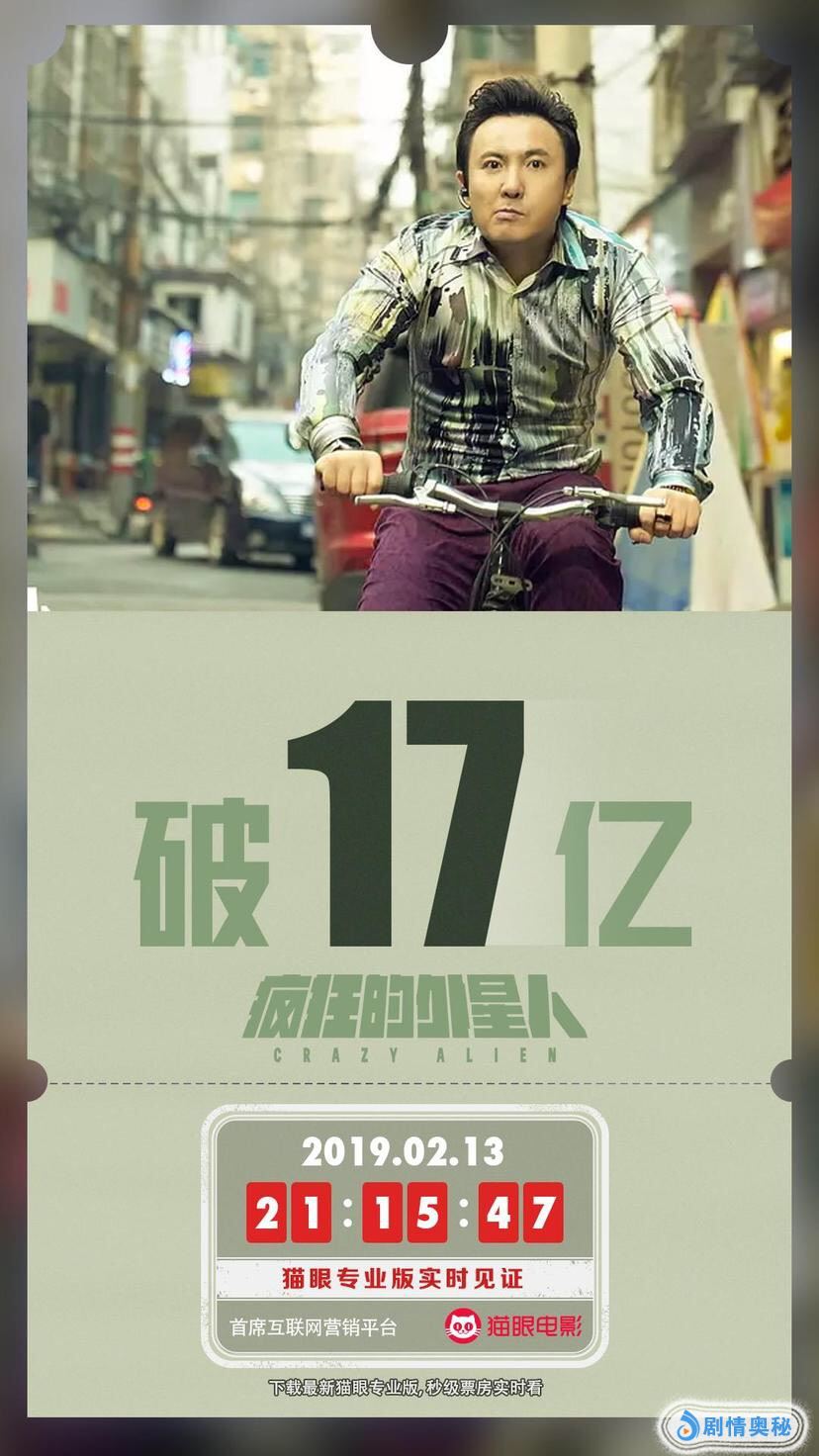 由宁浩执导、黄渤沈腾主演的“疯狂3.0”《疯狂的外星人》上映9天,票房表现不俗,根据猫眼专业版数据显示,目前截止2月13日21时15分,票房已经突破17亿,正在朝着20亿迈进。此票房也已突破宁浩导演由2014年《心花路放》11.69亿创造的最高票房成绩。