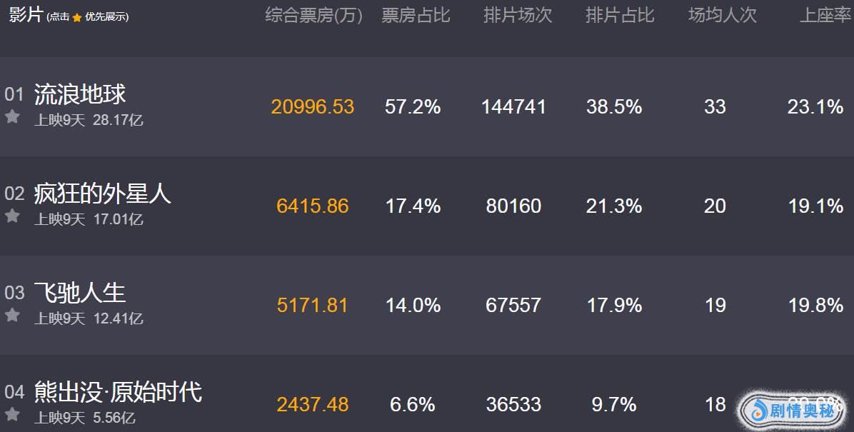 吴京《战狼》系列爆红后一发不可收拾,他最新主演的科幻大片《流浪地球》又一次轰动全球。该片春节票房大爆,仅上映9天票房就了破28亿元,在北美的票房开画也爆了,平均每家戏院收2.6万美元,力压好莱坞大片上座率夺冠,虽然首周仅218万美元,但要是给大规模上映它票房绝对不差。