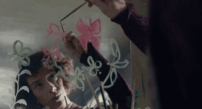 她先是在窗户上画一些花花草草,然后在墙上画蓝天小鸟,当她画满了小屋之后,她又在木板上画,在纸片上画…