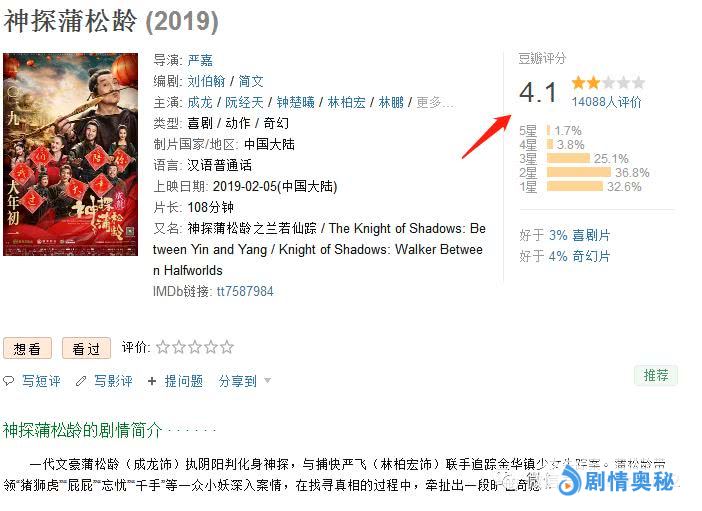 一直在贺岁档长盛不衰的成龙大哥,在强手如云的2019春节档似乎是有些大意失荆州了。影片《神探蒲松龄》 上映10天,豆瓣4.1分,累计总票房仅有1.38亿,估计亏本买卖是板上钉钉了。(截止发文时间)