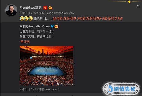 导演郭帆则转发了这条微博并说:“谢谢澳网……”从3个捂脸哭的表情来看导演自己估计也是没想到澳网都会用上电影中的这个梗。