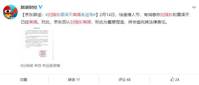 根据最新消息, 京东已经站出来辟谣,称该爆料捏造事实,刘强东先生与章泽天女士并没有离婚。纯属无中生有、蓄意捏造的谣言。