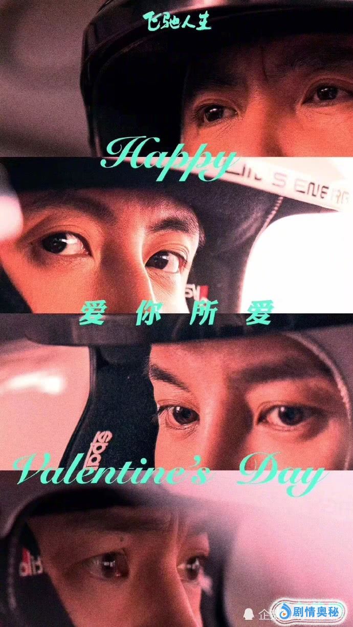 《飞驰人生》的海报,是四个赛车手和领航员比赛时候的眼神,配上文字:爱你所爱。英文是:情人节快乐!