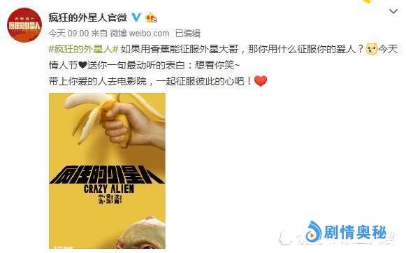 微博文字:“如果用香蕉能征服外星大哥,那你用什么征服你的爱人?带上你爱的人去电影院,一起征服彼此的心吧!”
