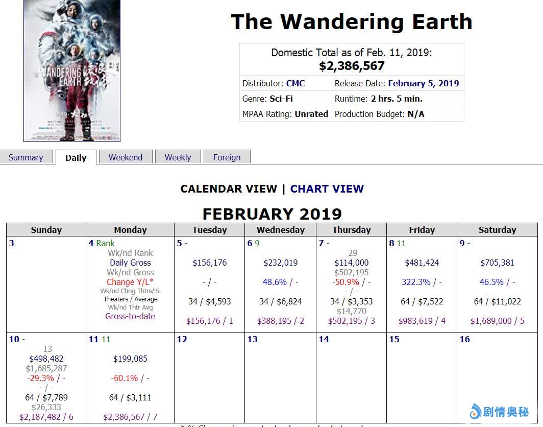 《流浪地球》凭借内地市场票房大爆被全民鼓吹,不可否认这是一部很有诚意的国产科幻片,但是若要说有多优秀也算不上。该片北美同步内地公映,结果票房却天差地别,首周末仅收到168万美元,截止2月11日累计238万美元(约1615万人民币)。这个成绩普通的不能在普通了,可是在国内却被吹上天了,这就有点太膨胀了,不要说什么规模小只有64家戏院上映,拉到大规模公映说明你影响力不够。