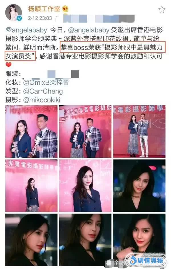 在最近杨颖又再次和获奖,她的工作室专门发微博祝贺杨颖