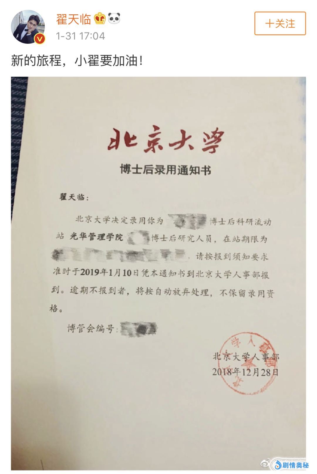 要是有月光宝盒、能时光倒流,相信翟天临肯定不会在微博晒出北大的博士后录取通知书。