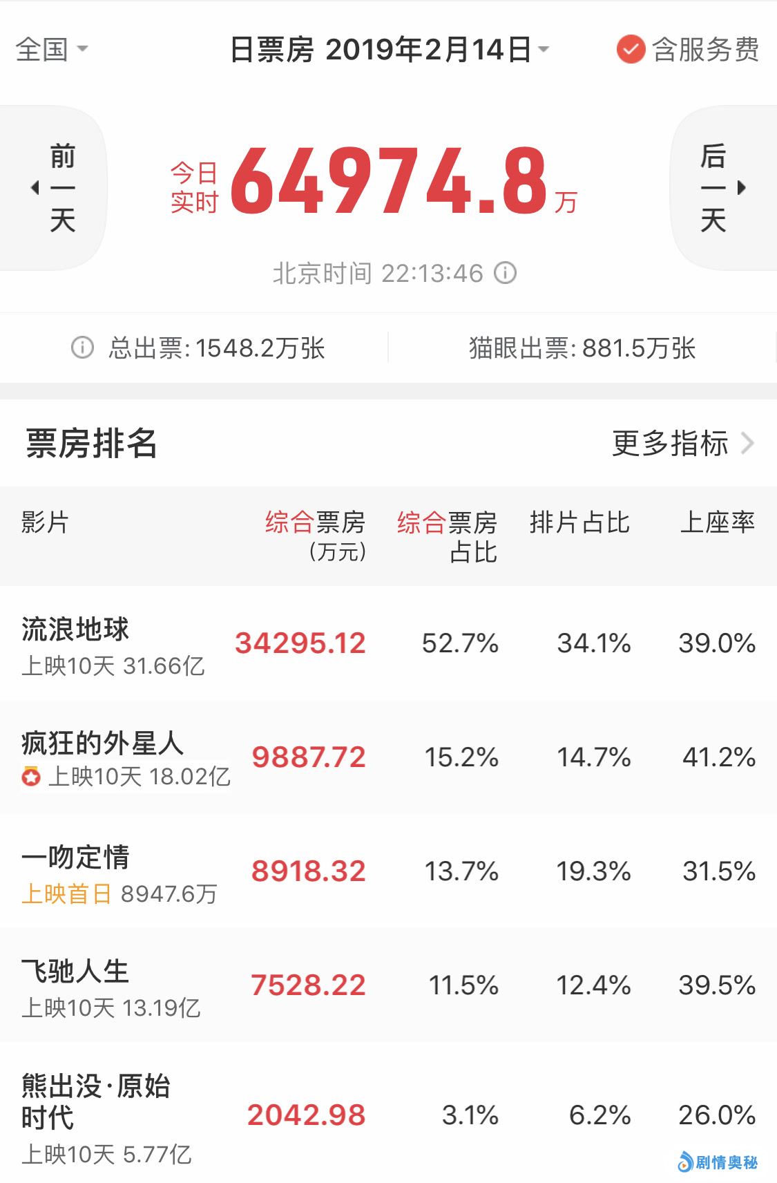 排在今天单日票房第一位的依然是国产科幻大片《流浪地球》,目前上映10天总票房已经突破31亿,单日票房高达3.4亿,毫无悬念的拿下了情人节的票房冠军,可见哪怕是在情人节,一部高口碑的科幻片对大家的吸引力还是很高的。