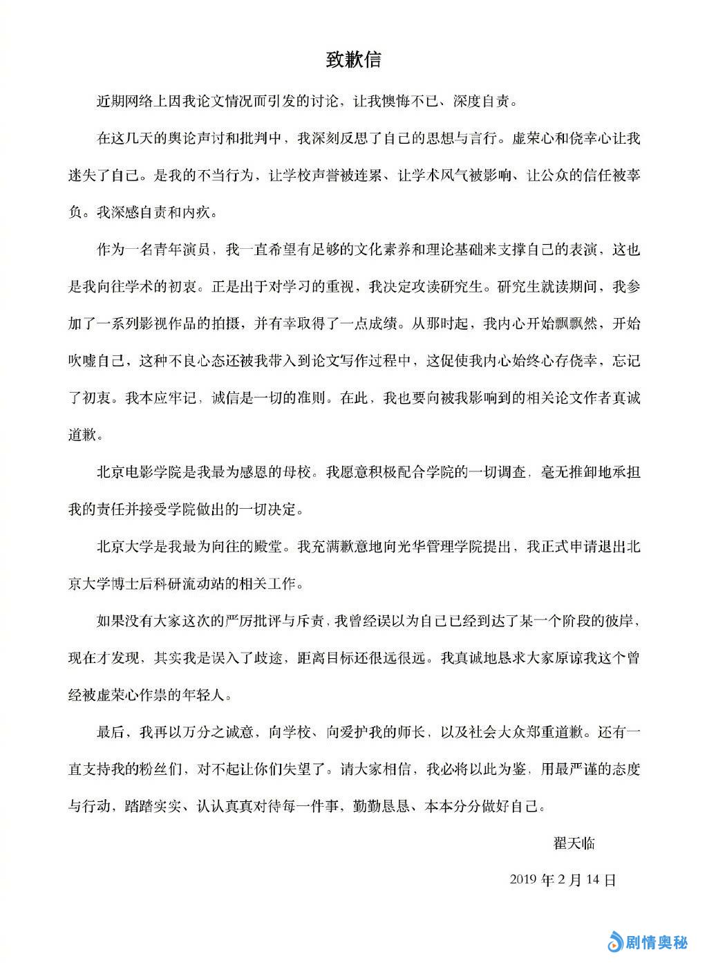 此前翟天临宣布自己被录用为北大博士后,目前也已经申请退出。对于此事,翟天临也发表了一份道歉信,承认了自己的错误,称“虚荣心和侥幸心让我迷失了自己”,学术风气被影响、学校声誉被连累,他本人也十分的自责和内疚。