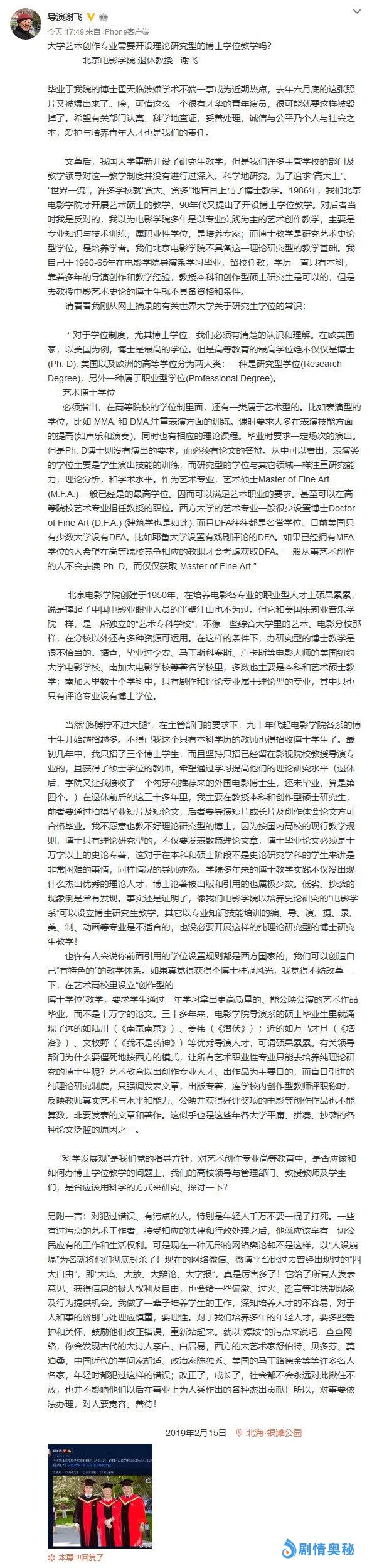 翟天临发布道歉信后,北京电影学院退休教授、著名导演谢飞也发文谈论了此事。
