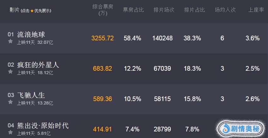 《流浪地球》还在不停的刷新着票房纪录,目前《流浪地球》的票房是一骑绝尘,情人节档期虽然有4部电影上映,但都无法对其构成威胁。在上映的第十天,《流浪地球》的单日票房还是超过了3亿,并且总票房超过32亿,成功的超越《我不是药神》,成为国产电影总票房第五名。