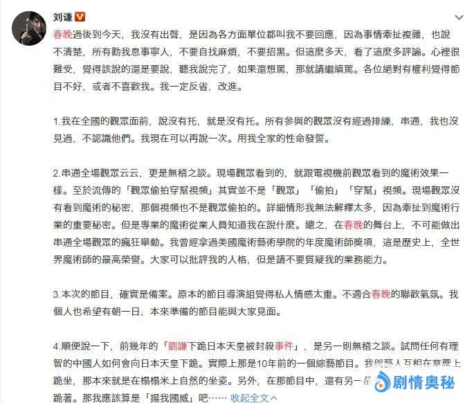 在这次解释春晚节目的微博中,刘谦再次提起此事,称被封杀纯属无稽之,当时的节目中还有自己坐着,对方跪着的姿势,那算不算“扬我国威”呢?