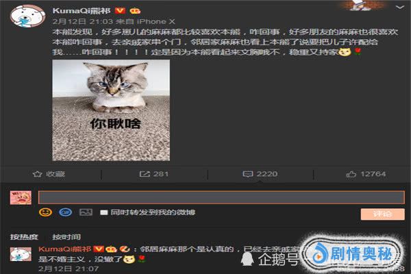 之后熊祁还专门在网上跟大家说了这件事,同时熊祁在说完之后还在下面紧接着进行了评论,熊叔告诉大家亲戚家的邻居是认真的,已经多次去亲戚家问这件事了。不过她的最后一句话却成为了亮点成功的引起了大家的争议。原来她在回应的最后告诉大家自己是一个不婚主义者,所以这也注定催婚这件事要失败了。