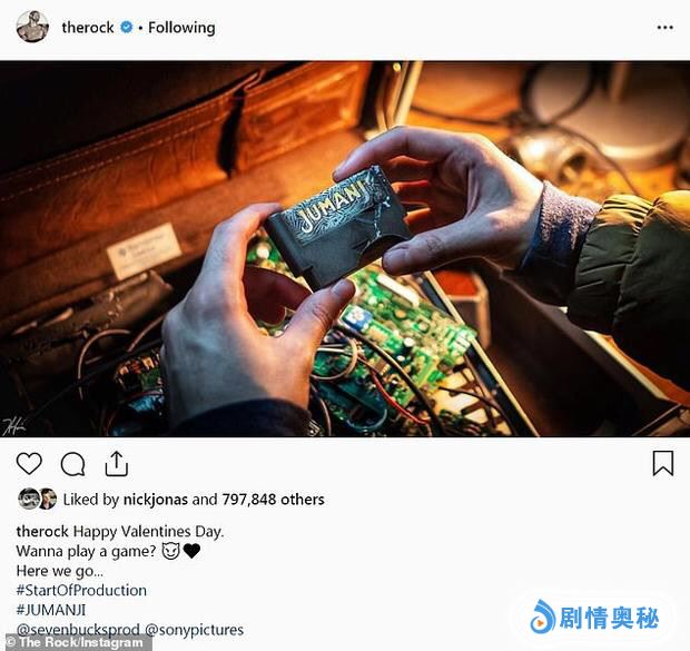 巨石强森又要拍新电影了!近日,强森在社交媒体上分享了一张照片,并且配文,“情人节快乐。想玩个游戏吗?走吧......”,宣布了电影《勇敢者游戏2》正式开拍了。