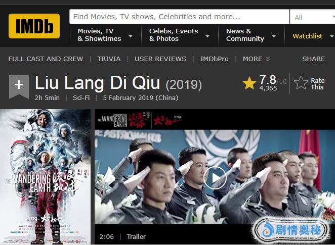 除了票房外,《流浪地球》的评分也力压同期外国电影。《流浪地球》目前在IMDb的评分为7.8分,同期的《乐高大电影2》7.2分,《倾听男人心》4.0分,《穷追不舍》6.7分。