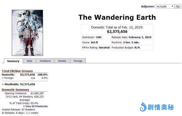 北美上映,《流浪地球》周末均馆票房创造佳绩,斩获了2.63万美元的纪录。对比同期外国影片,上周的北美周末票房冠军《乐高大电影2》,均馆票房8000美元。
