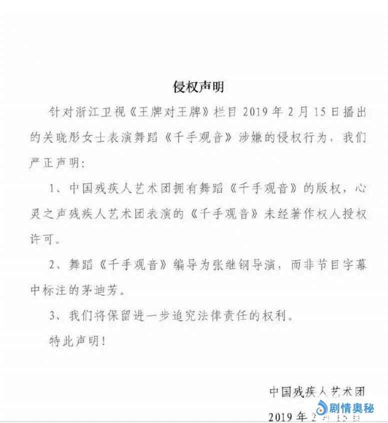 他说“舞蹈《千手观音》的编导是张继刚,著作权人是他们,未经许可的演出,已经涉嫌侵权了”,第二条更直接“关晓彤和浙江台是被李鬼给忽悠了”,更是直言将保留追究法律的责任。