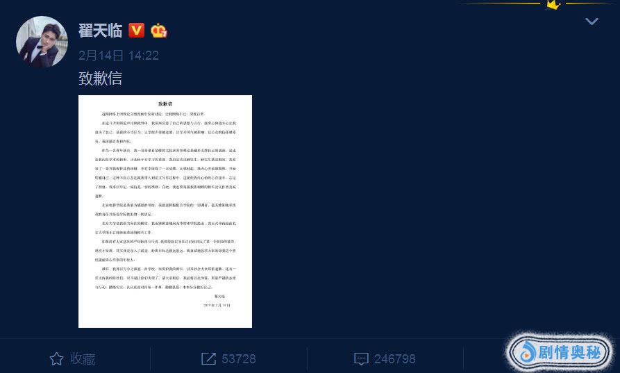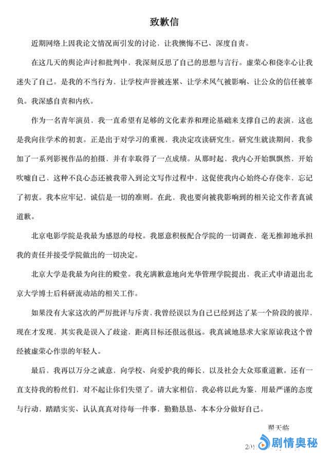 当相关事情不断的发酵后,他本人也是第一时间在社交平台上发表了一篇“道歉信”,字里行间也能够看的出他的后悔以及态度和希望人们能够理解他的渴望,但细心的网友们真是强大的,直接再次发生声称他就连这篇“道歉信”都是抄的。