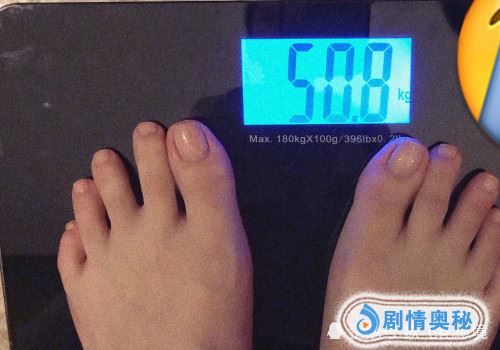 在照片上看,景甜的表情是不开心的。很多人都觉得,难道景甜为体重感到烦恼?但是在照片上看,景甜也不是很胖。感觉跟以前没有什么差别,为什么会为此看到烦恼呢?但是看到她站在秤上的数字,瞬间就明白了。体重秤上的数字是50.8公斤,很多明星对于自己的体重,就像控制在50公斤之内。