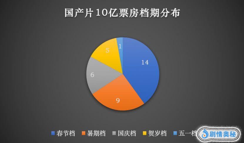 而在档期方面,作为全年第一大档期,春节档毫无悬念问鼎诞生10亿票房最大的档期,产量高达14部。而长达2个月的暑期档更是紧随其后,产出9部。另外一个具有7天长假的国庆档产出6部。而作为产生第一部10亿票房的贺岁档,自2018年开始跌入谷底,仅有5部产出。而“清明”“五一”“端午”“中秋”小长假档期,则只有一部现象级热度的《后来的我们》夺得,预计未来在短期内,也不会有票房预期10亿+量级影片定档于此。