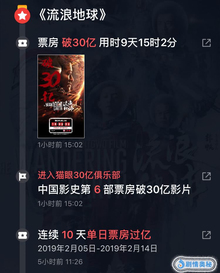 3天破10亿,6天破20亿,10天破30亿,《流浪地球》自上映后捷报频传。