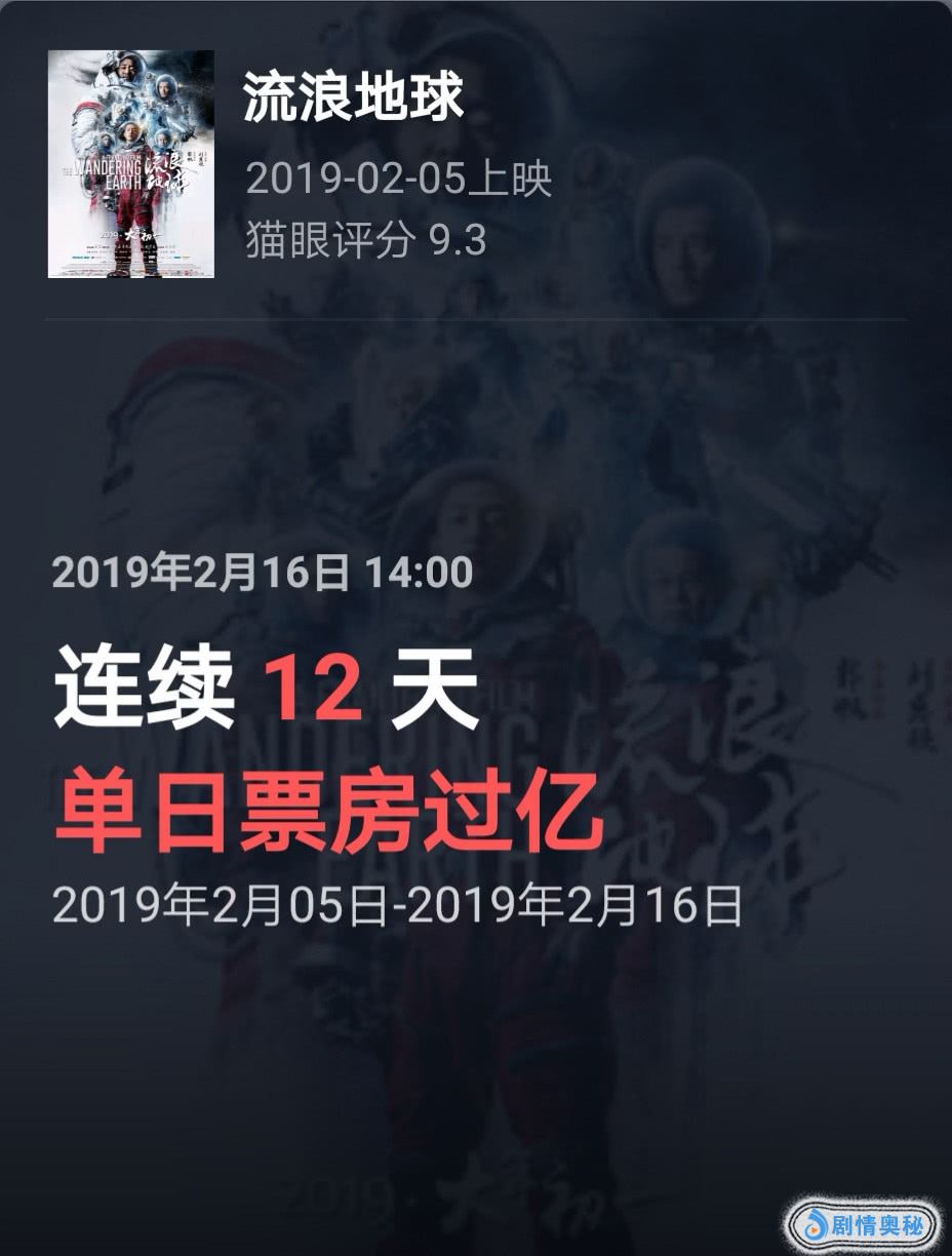 《流浪地球》的票房势头太猛了,自从2月5日上映起,电影已经连续12天单日票房过亿。事实上,自从上映第2天票房逆袭之后,《流浪地球》的单日票房基本保持在2亿以上,甚至连续5天突破3亿。